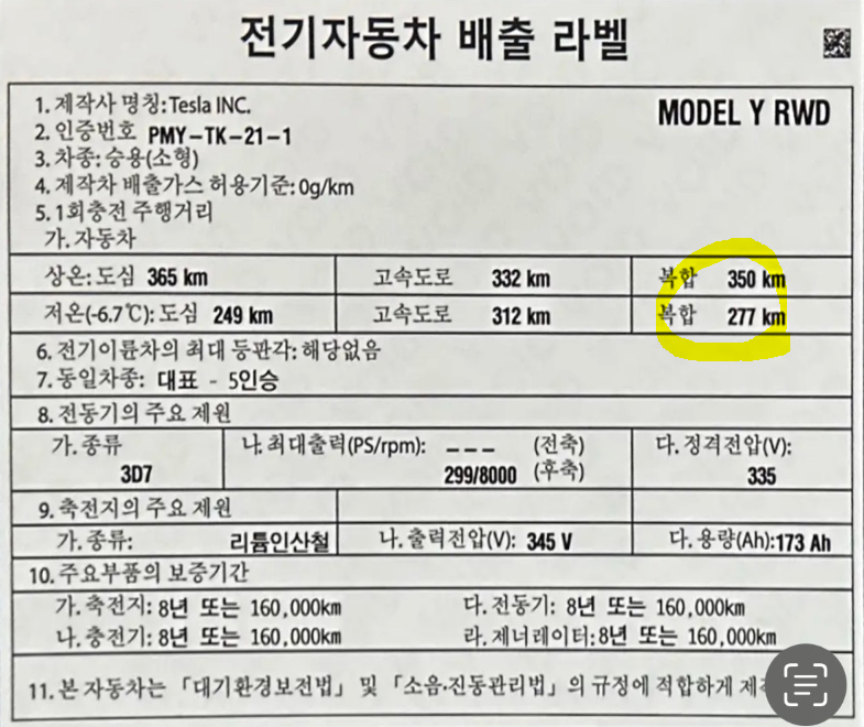저온에서의 주행거리는 277km이기 때문에, 주행거리/연비 보조금에서 약 35만원 정도 차감이 될 수 있습니다.